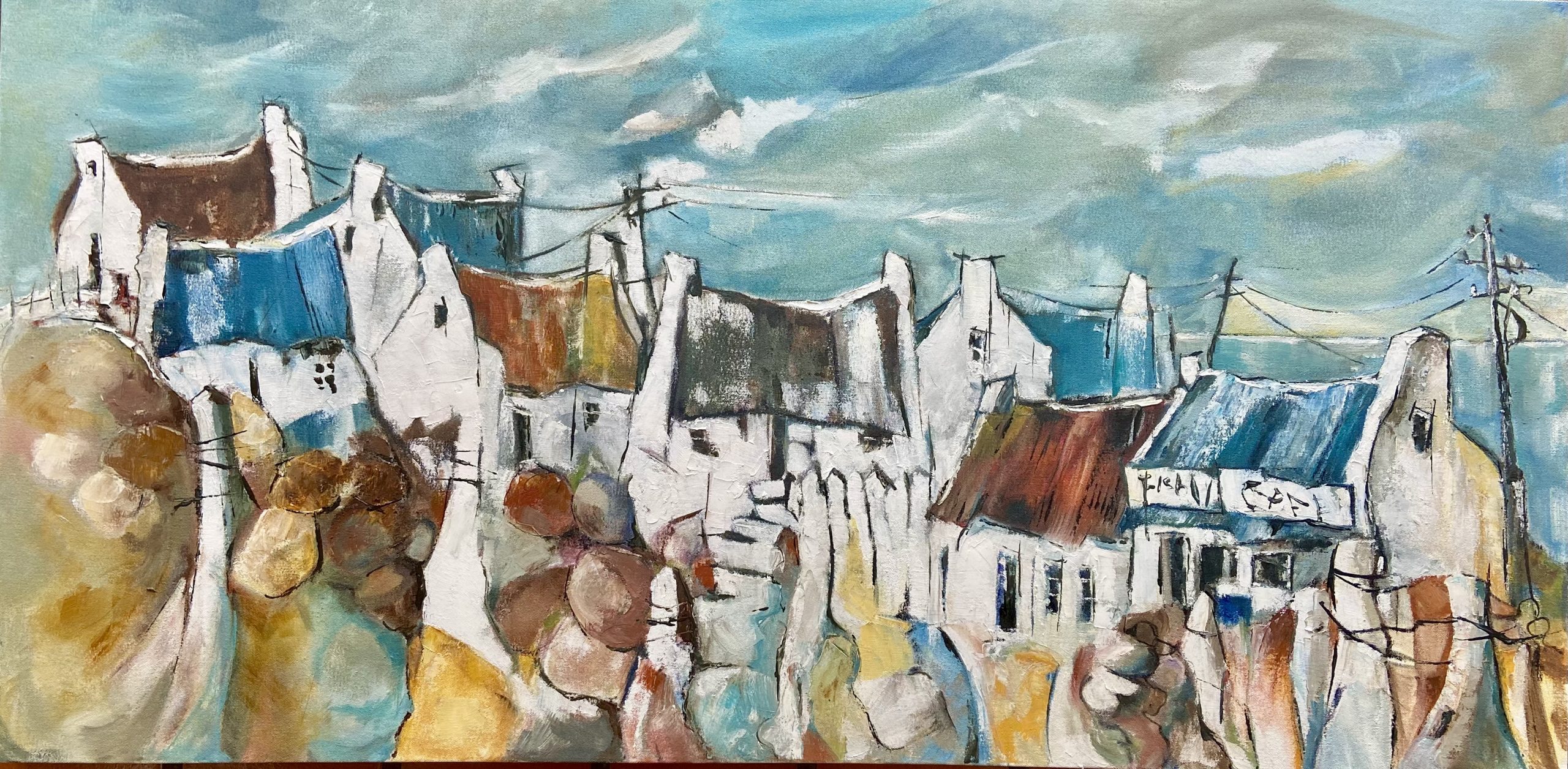 Framed with white floating frame size; 1200 x 600mm without frame A typical scene of a small fisherman’s village with a corner cafe for basic supplies