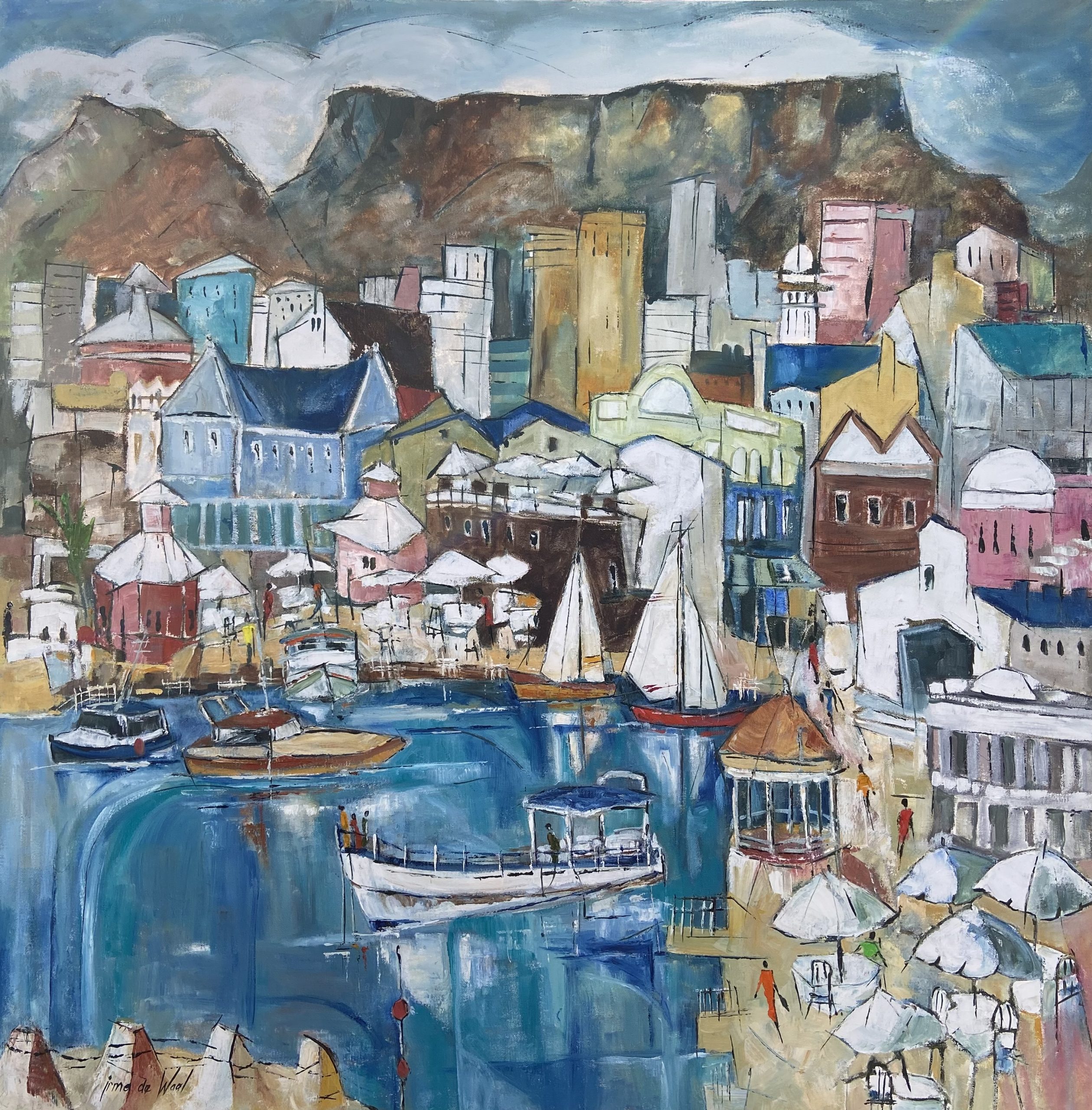 Original oil painting on stretched canvas. 1000 x 1000 mm. Framed with modern white floating frame. The painting depicts the beautiful Cape Town Waterfront with Table Mountain in the background.