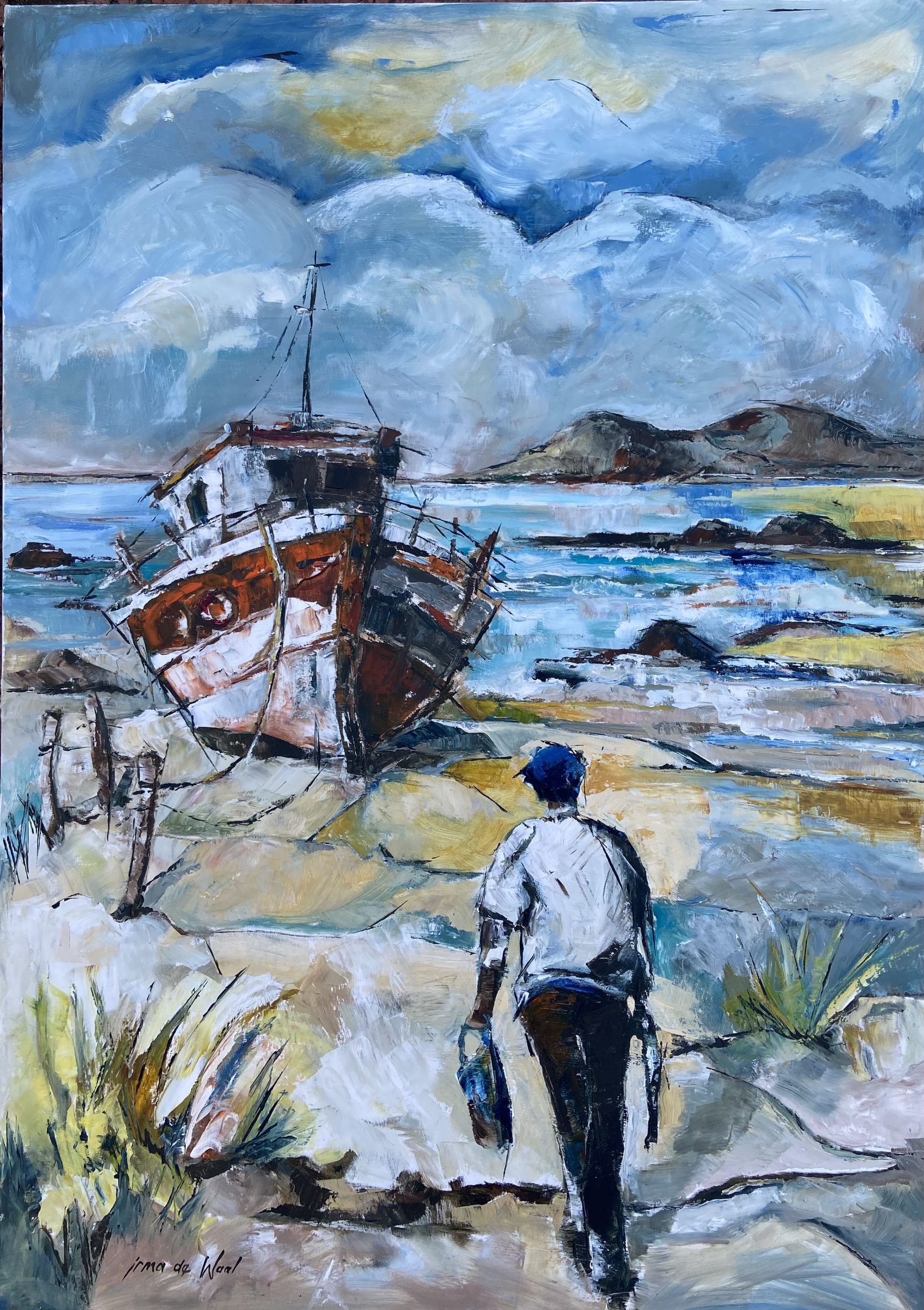 The painting depicts a fishing boat on the shore with its skipper walking towards it.